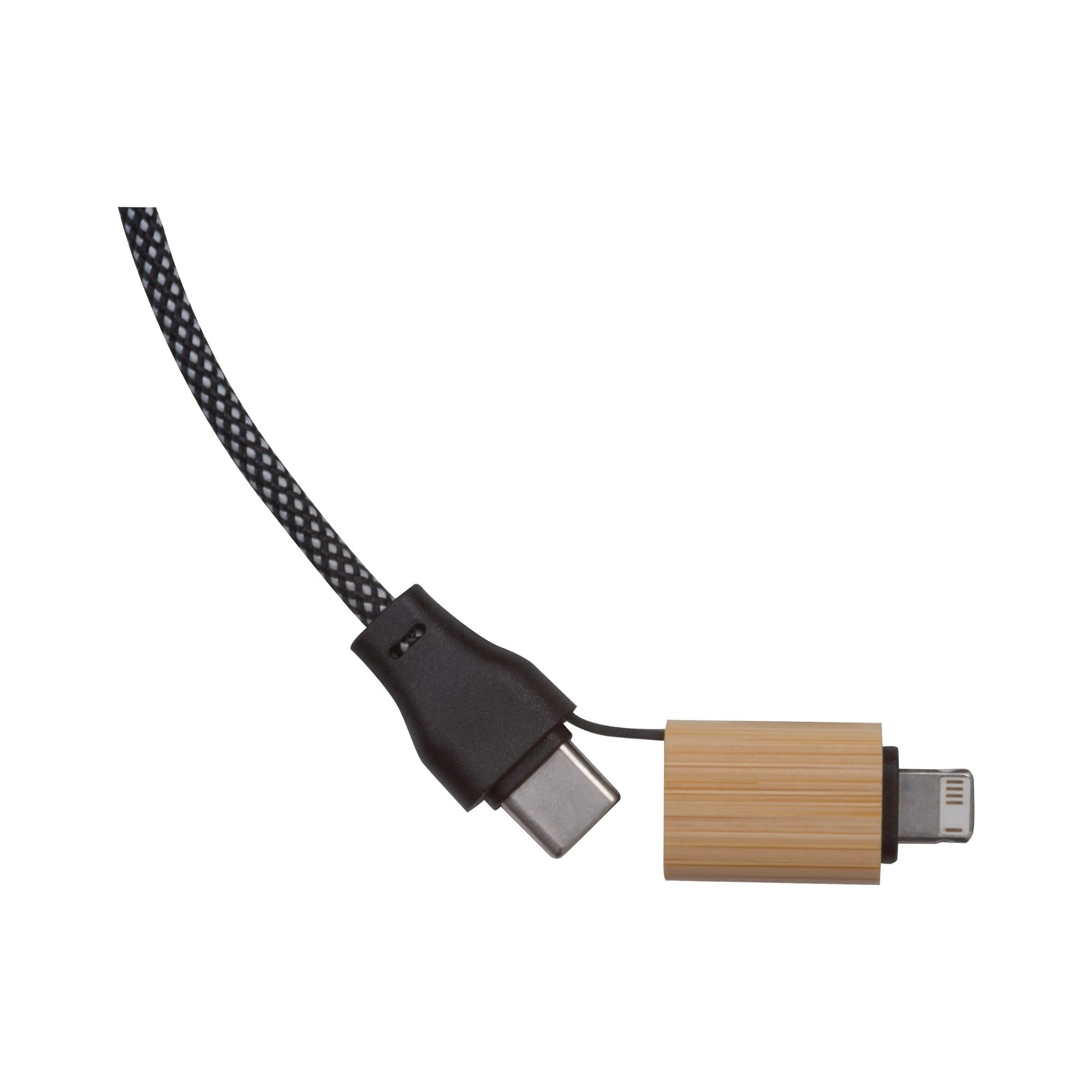 Die Ummantelung aus recyceltem PET (RPET) schützt zuverlässig vor Kabelbrüchen, während die Bambusfläche Platz für eine hochwertige Lasergravur Ihres Logos bietet.