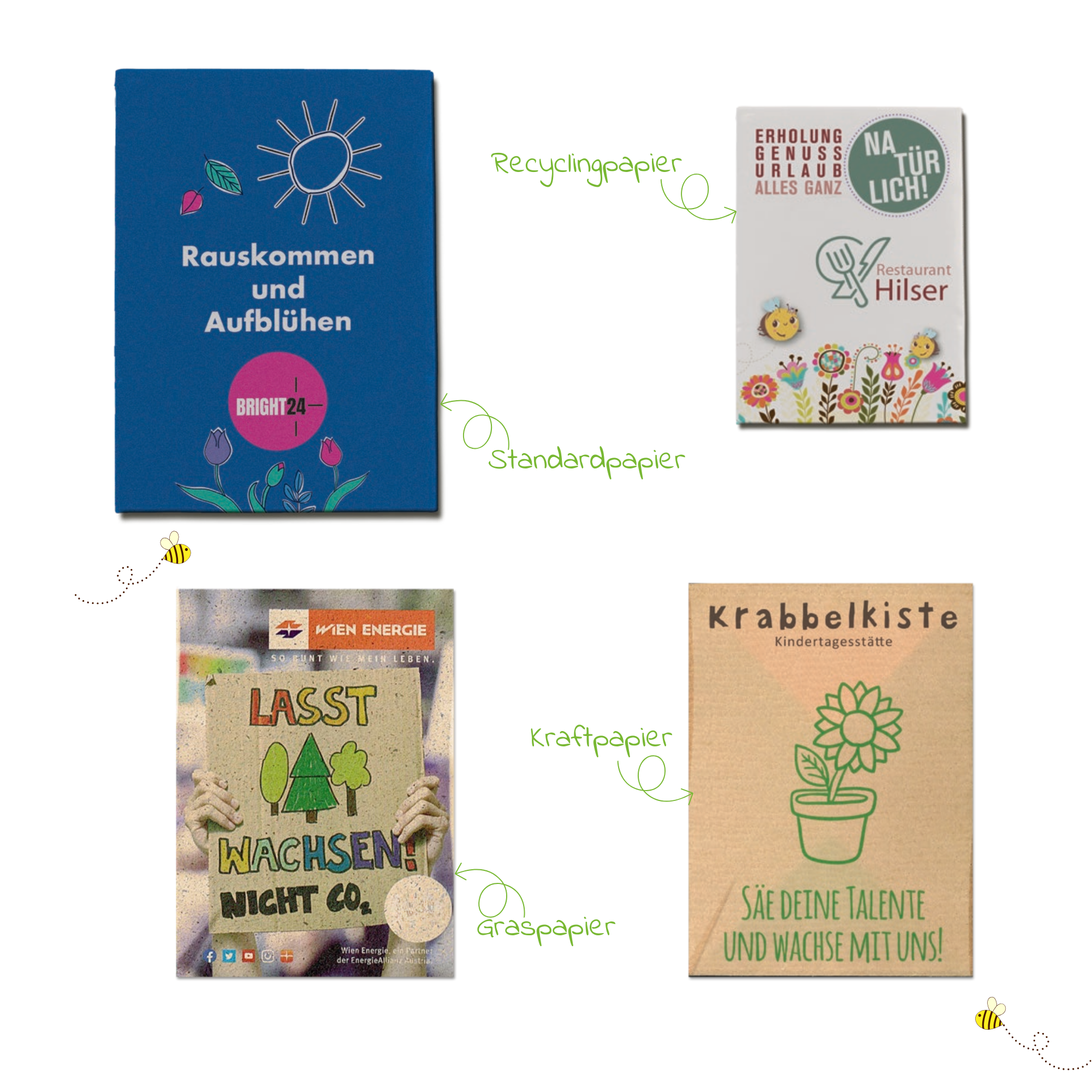 🌍 Vier Papieroptionen: Graspapier, Recyclingpapier (polarweiß oder Naturoptik), Natronkraftpapier oder Standardpapier – jede Variante bietet einen besonderen Look und ist vollfarbig bedruckbar.